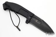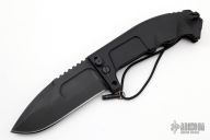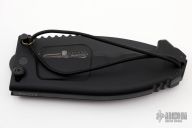 This RAO II Axis Lock Folder has a matte black finished N690 stainless steel spear point/ tanto blade (stamped CK0246Jon A-side) with notched thumb rest and multiple grind planes. This knife features a removable threaded pin that prevents deploying the blade when stored. Handle is black aluminum with lanyard and glass breaker. Comes with original box, papers, and nylon sheath with sharpener. Excellent Condition.