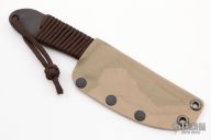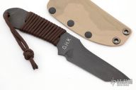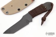 This Desert Tanto by GHK features a black oxide finished blade with notched thumbrest made from Sandvik Cutlery Steel, .131" blade stock and 1.265" blade depth, full tang construction with cord wrapped grip. Comes with a kydex sheath. New from maker.