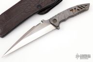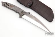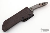 This knife by Kazak Knives features a Damascus blade with satin finished grinds and etched flats, sharpened top edge, .206" stock and 1.445" blade depth, full tang construction. The handle has Damascus scales over copper liners, skull crusher at the butt. Comes with a brown leather covered kydex sheath with belt loop. Comes with a nylon zippered case. Has a couple of small spots on the blade, otherwise excellent condition.