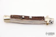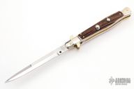 Angelo Campolin Sr. was born in 1923 in Maniago, Italy. He worked on perfecting his knife making skills before WWII and at this time made his first switchblades. After the war, in 1947 he started his company and made 30 stilettos with the marking “Angelo Campolin”. In the 1970’s Angelo’s son Gianni started to work in the company and they were specializing in folding hunting knives and also manual folding stilettos for the Robert Klaas company in Solingen Germany with their Kissing Cranes mark. In 2002 American switchblade collectors Dan Fuller, Brad West, and Tim Zinser were visiting Maniago and enjoying a few glasses of wine in a bar with Angelo Jr. and Gianni. The discussion was about a new name for some knife projects they wanted to pursue. It was Brad West that suggested the tang stamp should be AGA, for Angelo, Gianni, Angelo, thus representing three generations in the knife making business. The Campolins liked it and it stuck. In the beginning it was just a few items, but grew to the point where now there are 12 models and different scale options. The goal has been to offer quality switchblades using the old methods and traditions. Being a collector himself, Angelo Jr. knows what others like. The company headquarters has moved to Austria with production still in the original Maniago shop, as well as the others in Maniago that produce the knives for A.G.A. Campolin.
