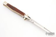 This pick lock auto by AGA Campolin features a mirror polished blade with a false top edge. Nickle silver guard and rear bolster and stag scales, brass liners. Nice function, strong firing and lock up. Has a little blade play, otherwise excellent condition. Dated 2019.