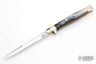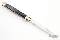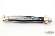 This pick lock auto by AGA Campolin features a mirror polished blade with a false top edge. Nickle silver guard and rear bolster and Brazilian horn scales, brass liners. Nice function, strong firing and lock up. Excellent condition. Dated 2019.