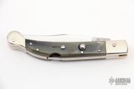 This Sahara lockback auto by AGA Campolin features a polished blade, Nickle silver bolster and Brazilian horn scales, brass liners. Nice function, strong firing and lock up. Excellent condition.