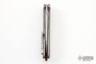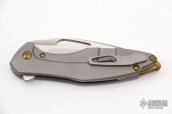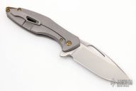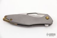 This Arius by Koenig knives features a two-tone blade with thumbhole and flipper. The handle has a nicely milled titanium frame with an anodized tip up clip, bronze anodized titanium backspacer and hardware. Has ceramic bearings and a ceramic detent ball. Nice detent, lockup and blade seating. Comes with original box and COA dated Januaray 13, 2022. New condition.