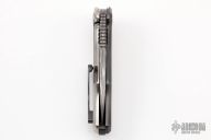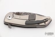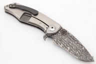 This Gladius by Robert Oldaker features a Damascus blade with notched thumbrest and flipper. The handle has a Zirconium front scale, backspacer and tip up clip, satin finished titanium lockside. Nice detent, lockup and blade seating. Excellent condition.