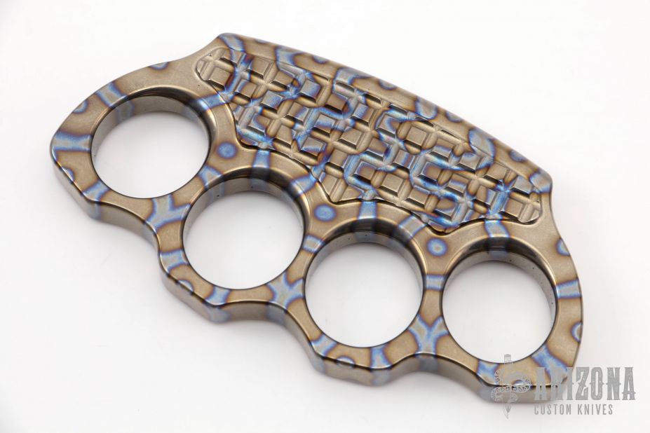 This Hand Tank by Microtech features flame finished titanium construction with milled frag pattern on the handle. Excellent condition. Comes with original box.