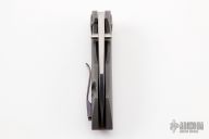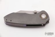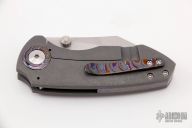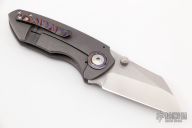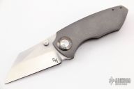 This Critter Wharnie by Matthew Christensen features a polished tumble finished blade with a false top edge and dual thumbstuds. The handle has a tumbled titanium frame complimented with blasted Zircuti tip up pocket clip and pivot collar.  Includes a Dragoncut knife pouch and COA, dated June 2019. Excellent condition.