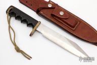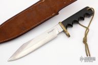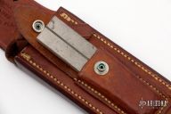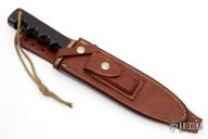 This Solingen Fighter by Randall Made Knives features a satin finished blade with sharpened top edge, .212" blade stock and 1.399" blade depth, full tang construction. The handle has a brass guard, black linen micarta grip with lanyard hole. Comes with a brown leather split back sheath. Has some scratches, has been sharpened and used, top half of the guard has been removed, otherwise fair condition for its age.