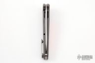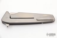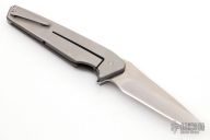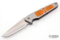 This Mark 7 from Will Moon features a two tone blade with satin flats and tumbled grinds, notched thumbrest and flipper. The handle has a satin finished titanium frame with bead blasted edges, orange G-10 inlays with black G-10 dots, two-tone notched titanium backspacer and tip up satin finished titanium clip, has IO-Stop ( IO-Stop stands for "Integral Over-travel" Stop ) and rides on thrust bearings. Nice detent, blade seating and lock up. Has some scratches, otherwise excellent condition. Comes with a zippered case.