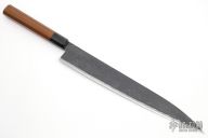 The Yanagiba by Takeda Knives is a long narrow kitchen knife traditionally used for slicing sashimi. The blade is Stainless Clad Aogami Super Steel (NAS) which is a high-carbon steel alloy with vanadium and is ground on both sides, .080" blade stock and 1.450" blade depth, hidden tang construction. As with all of Takeda's knives, it has a strong sharp edge. The octagon shaped wood handle is easy to hold. Comes with original packaging. Brand new from maker.