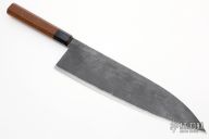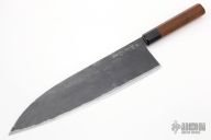 The Gyuto by Takeda is traditionally used for cutting a head of cabbage or slicing meat. The blade is stainless clad Aogami Super Steel (NAS) which is a high-carbon steel alloy with vanadium, .103" blade stock and 2.672" blade depth, hidden tang construction. As with all of Takeda's knives, it has a strong sharp edge. The octagon shaped wood handle is easy to hold. 280mm cutting edge. Comes with original box. New from maker!