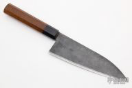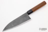 The blade is Stainless Clad Aogami Super Steel (NAS) which is a high-carbon steel alloy with vanadium. As with all of Takeda's knives, it has a strong sharp edge. The octagon shaped wood handle is easy to hold. 160mm cutting edge, .066" blade stock and 2.045" blade depth, hidden tang construction. Comes with original box and papers. Brand new from maker!