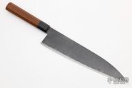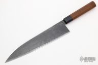 The blade is Stainless Clad Aogami Super Steel (NAS). As with all of Takeda's knives, it has a strong sharp edge. The octagon shaped wood handle is easy to hold. 245mm cutting edge, .090" blade stock and 2.066" blade depth. Comes with original box and papers. Brand new from maker.
