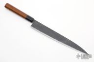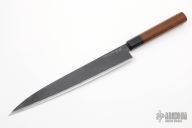 The Yanagiba by Takeda Knives is a long narrow kitchen knife traditionally used for slicing sashimi. The blade is Stainless Clad Aogami Super Steel (NAS) which is a high-carbon steel alloy with vanadium and is ground on both sides, .085" blade stock and 1.408" blade depth, hidden tang construction. As with all of Takeda's knives, it has a strong sharp edge. The octagon shaped wood handle is easy to hold. Comes with original packaging. Brand new from maker.