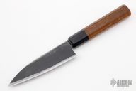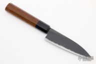 The Mini Petit knife is traditionally used as a paring knife or all-purpose small kitchen knife. The blade is Stainless Clad Aogami Super Steel (NAS) which is a high-carbon steel alloy with vanadium. As with all of Takeda's knives, it has a strong sharp edge. The octagon shaped wood handle is easy to hold. 120mm cutting edge, .054" blade stock and 1.267" blade depth, hidden tang construction. Comes with original box and papers. New from maker.