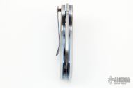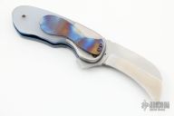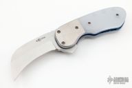 This Bug flipper from J.E. Rooda has a satin finished hawkbill blade with a notched thumbrest and flipper. The handle has orange peel finished and dovetailed titanium bolsters, natural G-10 scales, anodized titanium liners, and a flame titanium pocket clip, tip down carry. Nice detent, lockup and great blade seating. Comes with makers card and hard case. Brand new from maker.