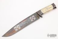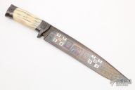 This Bowie by Conny Persson features a mosaic Damascus blade with pictures of the Devil, Multi-bar construction, .280" blade stock and 1.896" blade depth, hidden tang construction. The handle has Mosaic Damascus guard and butt, walrus ivory grip, mosaic Damascus inlay in the butt. Comes with a Velcro case. Excellent condition.