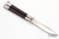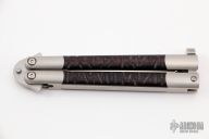 This balisong by 29 Knives features a satin finished bowie blade. The handle is composed of satin finished integral stainless steel with g10 inserts. There is a little marring on the hardware. Comes with a Bill's case. Has scratches on the blade and handle, otherwise great condition.
