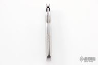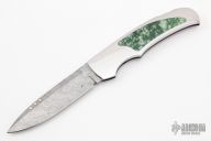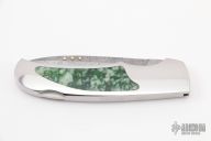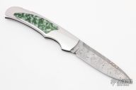 This Boy Scout lockback from Rick Genovese features a Damasteel blade with false top edge and gold Dellana Dots. The handle has a mirror polished stainless steel frame with Emerald Flower Jade inlays. Blade is centered when closed and locks up with no play. New from maker. Knife comes with a leather slip sheath.
