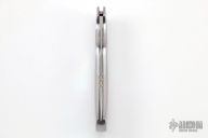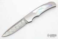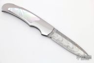 This Boy Scout lockback from Rick Genovese features a Damasteel blade with false top edge and gold Dellana Dots. The handle has a mirror polished stainless steel frame with mother of pearl inlays. Blade is centered when closed and locks up with no play. New from maker. Knife comes with a leather slip sheath.