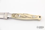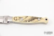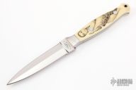 This Integral Dagger by Paolo Gidoni features a hand rub satin finished double edged blade with full tapered tang construction. The handle has integral bolsters, hippo tooth scales with nude scrimshaw of Natasha Kinski on both sides by Laura Vibrioni. Comes with a brown leather sheath and a zippered case. Excellent condition.