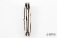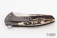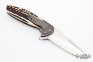 This Nitro linerlock flipper by Peter Carey features a hand rub satin finished blade with a false top edge, notched thumbrest and flipper. The handle has jigged titanium bolsters, stag scales, anodized and bead blasted titanium liners and tip down pocket clip. Nice detent, lockup and blade seating. Excellent condition.