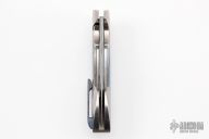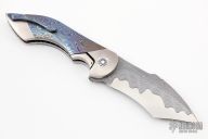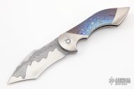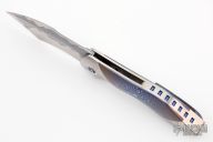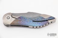 This Framelock Flipper by the Fischer Bros features a San Mai Damascus tanto recurve blade with a false top edge and a notched flipper. The handle has a orange peeled titanium frame with polished edges, black timascus scales, mother of pearl inlaid custom pivot and pivot collars, black timascus tip up clip with hidden screws and a notched and two-tone anodized titanium backspacer. Nice detent, lockup, action and blade seating, rides on bearings. Excellent condition. Hard to come by!