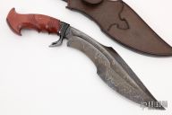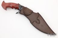 This knife by The Sobral Brothers is incredible, it features a Damascus clip point recurve blade with a nearly sharpened top edge, .289" blade stock and 3.245" blade depth, hidden tang construction. The handle has a lavish blued steel guard with engraved texture and gold inlays, beautiful dyed curly maple grip and stainless pin. Fits amazing in the hand. Comes with a skillfully hand-tooled brown leather sheath, and a very classy leather zippered case. New from maker. They just keep getting better and better don't they!