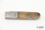 This lockback by Barry Davis features a drop point Damascus blade with fileworked spine, gold thumbstud with black stone inlay. The handle has fluted Damascus bolsters, mammoth ivory scales, gold pins, toothpick and lanyard bail, fileworked nickel silver liners, fileworked stainless steel lockbar and backspacer. Nice lockup and blade seating, very smooth. Excellent condition.