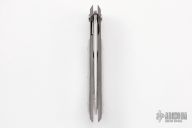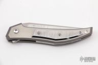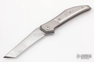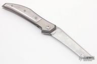 This Lares by Stefano Compostella features a Bjorkman Twist Damasteel tanto recurve blade with notched flipper, mirror polished swedge. The handle has a two-tone grade 5 titanium frame with Damasteel overlays and fluted backspacer, inlaid liner. Rides on bearings, nice detent, lockup and blade seating. Comes with a zippered case. New from maker. Comes with COA.