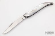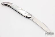This Midlock folder by Ryuichi Kawamura features a hand rubbed satin finished blade with mirror polished ricasso, has a nail nick and false top edge. The handle has integral stainless steel bolsters and liners, escutcheon and spring, mother of pearl scales. Has some light scratches, otherwise excellent condition. Comes with a zipper case. Another beautiful piece from Ryuichi.