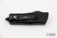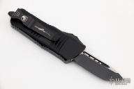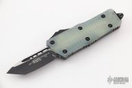 This Troodon Mini OTF automatic by Microtech knives features a black finished tanto blade with satin finished flats. The handle has a jade green G-10 top, black aluminum frame with black hardware, tip down carry. Glass breaker. S/N 085. Dated LVCKS 2022. Comes with original box and papers. Excellent condition.