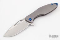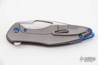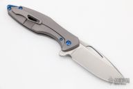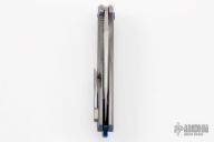 This Arius by Koenig knives features a two-tone blade with thumbhole and flipper. The handle has a nicely milled titanium frame with a titanium tip up clip, anodized titanium backspacer. Has ceramic bearings and a ceramic detent ball. Nice detent, lockup and blade seating. Comes with original box and COA January 13, 2022. Comes with a set of anodized titanium screws. Excellent condition.
