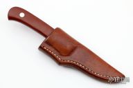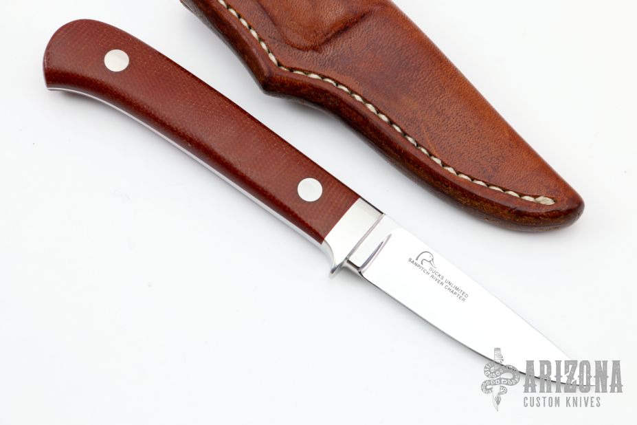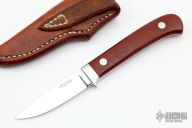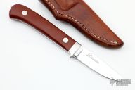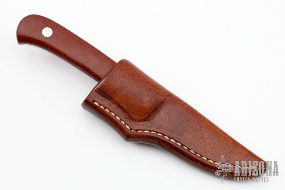 This Bird and Trout by Steve Johnson features a mirror polished blade, .172" blade thickness and .667" blade depth, full tapered tang construction. The handle has a stainless steel guard and brown canvas micarta scales with red liners. Mirror polished tang. Comes with a brown leather sheath marked "005" and a zippered case. Excellent condition.