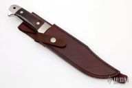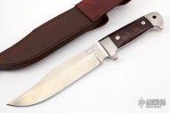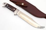 This Integral Bowie Prototype by Edmund Davidson features a satin finished hollow ground blade, .250" blade stock at the ricasso and 1.675" blade depth, integral construction with desert ironwood inlays and a lanyard hole at the butt. Comes with a brown leather sheath and a zippered case. Excellent condition. Dated 12-30-92.