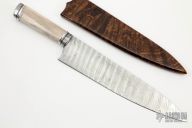 This Kitchen Knife by Michael Andersson features a Damascus blade with .096" blade stock and 2.132" blade depth, hidden tang construction. The handle has a Damascus guard, reindeer antler grip with a Damascus butt. Comes with a beautiful walnut scabbard and a zippered case. Has a few light scratches, otherwise excellent condition.