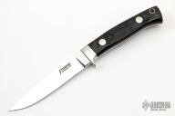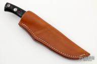 This Hunter by John Young features a mirror finished blade with .199" blade stock and .785" blade depth, full tapered tang construction. The handle has mirror polished stainless steel guard, bark buffalo horn scales with red liners. Comes with a brown leather sheath and zippered case. Excellent condition.