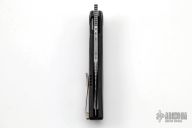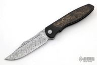 This Mini Tempest from Brian Nadeau features a Damasteel bowie blade with a fuller and notched thumbrest/front flipper. The handle has a black PVD titanium frame with Gold Dark Matter FatCarbon inlays, satin titanium tip up clip. Nice detent, lockup and blade seating, stainless lockface insert. Includes original box. New from maker!
