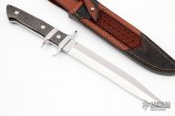 This Loveless Style Big Bear Sub-hilt by Rick Genovese features a mirror polished blade with a sharpened top edge near tip, .230" blade stock and 1.211" blade depth, full tapered tang construction. The handle has mirror finished stainless steel guard and sub-hilt, carbon fiber scales, lanyard hole at the butt. Excellent fit and finish. Includes a zippered case and a hand tooled brown leather sheath by C. Scott. New from maker.