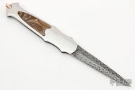 This Interframe Lockback from Warren Osborne features a Damascus blade with a nail nick. The handle has a stainless steel frame with petersite inlays, gold lanyard bail. Includes a zipper case. Excellent condition. PROTOTYPE on blade.