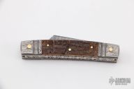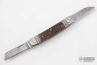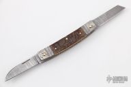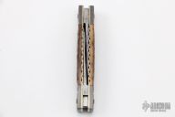This Half-Congress by Barry Davis features Damascus blade with nail nicks. The handle has bluted Damascus bolsters, bark mammoth ivory covers, gold pins, anodized and fileworked titanium liners, fileworked stainless steel spring. Has half-stops, flush in the open and closed positions. Comes with a zippered case. Excellent condition.