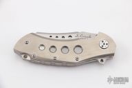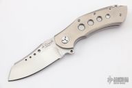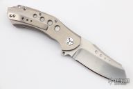 This liner-lock flipper by Sergio Consoli features a hand-rubbed satin finish blade with flipper. The handle has satin finished titanium scales, stainless steel liners, titanium backspacer.  Sergio's ball bearing system gives the knife an effortless flip that requires no wrist action.  Perfect lockup, detent, and blade seating. Includes certificate from maker, and zippered case. Excellent condition.
