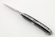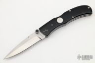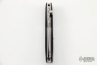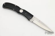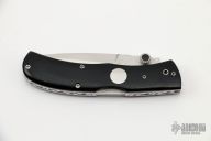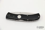 This D/A lockback auto by Charlie Dake features a hand rub satin finished blade with false top edge and nail nick, fileworked blade spine. The handle has black G-10 scales, and stainless steel liners and backspacer with filework. Nice lockup, action and blade seating. #9591 on blade. Excellent condition. Comes with a felt pouch.