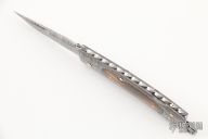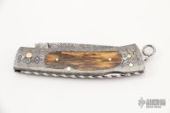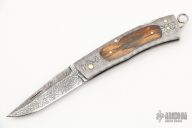 This Sole Authorship Lockback folder features a Damascus blade with nail nick, false top edge, and fileworked spine. The handle has a Damascus frame with mammoth ivory inlays, fileworked stainless steel backspacer, gold pins, has a lanyard bail. Comes with a zippered case. Nice lockup and blade seating. Excellent condition.