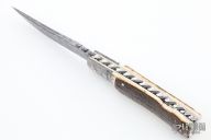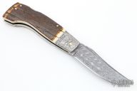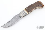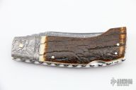 This Sole Authorship Lockback folder by Kaj Embretsen features a Damascus blade with nail nick and fileworked spine. The handle has Damascus fluted bolsters, mammoth ivory scales, anodized titanium liners, fileworked stainless steel backspacer, gold pins. Comes with a zippered case. Nice lockup and blade seating. Excellent condition.