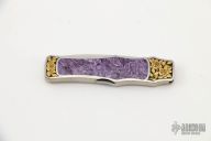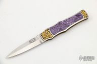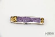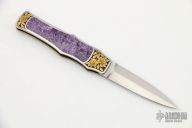 This Interframe lockback folder from Jack Busfield features a hand rub satin finished blade with nail nick. The handle is comprised of an engraved and gold inlaid stainless steel frame with Chaorite inlays and stainless steel lock spring. Has "Edge Rope" gold inlays all around the edges of the frame, spectacular! Excellent condition. Includes zippered case. The handle has been engraved by Sam Alfano