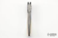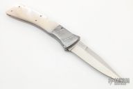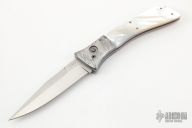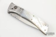 This Button Lock Auto ("9408" stamped on B-side ricasso) has a hand rub satin finished blade with false top edge and fileworked spine. Handle has beautiful mother of pearl scales, with Damascus dovetailed bolsters, and filed auto/ lock button. Stainless steel backspacer is fileworked, including under spine. Nice blade seating, action and lockup. Excellent condition.