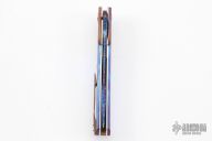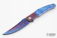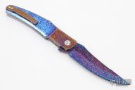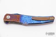 This linerlock flipper by Sergio Consoli features a Bertie Rietveld Dragonskin Damascus blade with notched flipper. The handle has Timascus scales, Inox steel liners, and an anodized titanium backspacer and tip up clip. Sergio's ball bearing system gives the knife an effortless flip that requires no wrist action. Nice lockup, detent and blade seating. Outstanding work. Excellent condition. Comes with zippered case and COA dated September 2018.