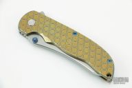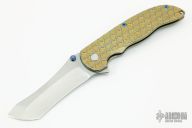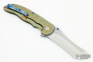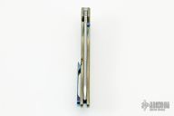 This Norseman (#546) by John Grimsmo features a tumbled blade with a single anodized titanium thumb stud, notched thumb ramp and flipper. Stonewashed and anodized titanium frame with a honeycomb pattern front scale and titanium screws. Mokuti tip up pocket clip. Very smooth action that requires no wrist movement. Nice detent, lockup and blade seating. Rides on ceramic bearings. Knife is in excellent condition, shows no signs of use or carry.