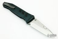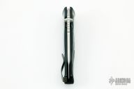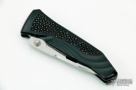 This TEI 020 by Rockstead features a mirror polished blade with a notched thumbrest and dual thumbstuds. The handle is black aluminum with rayskin inlay. Tip up satin stainless steel clip and a single stainless steel liner. Comes with original box and papers. S/N 020. Has some light scratches on the blade and handle. Excellent condition.